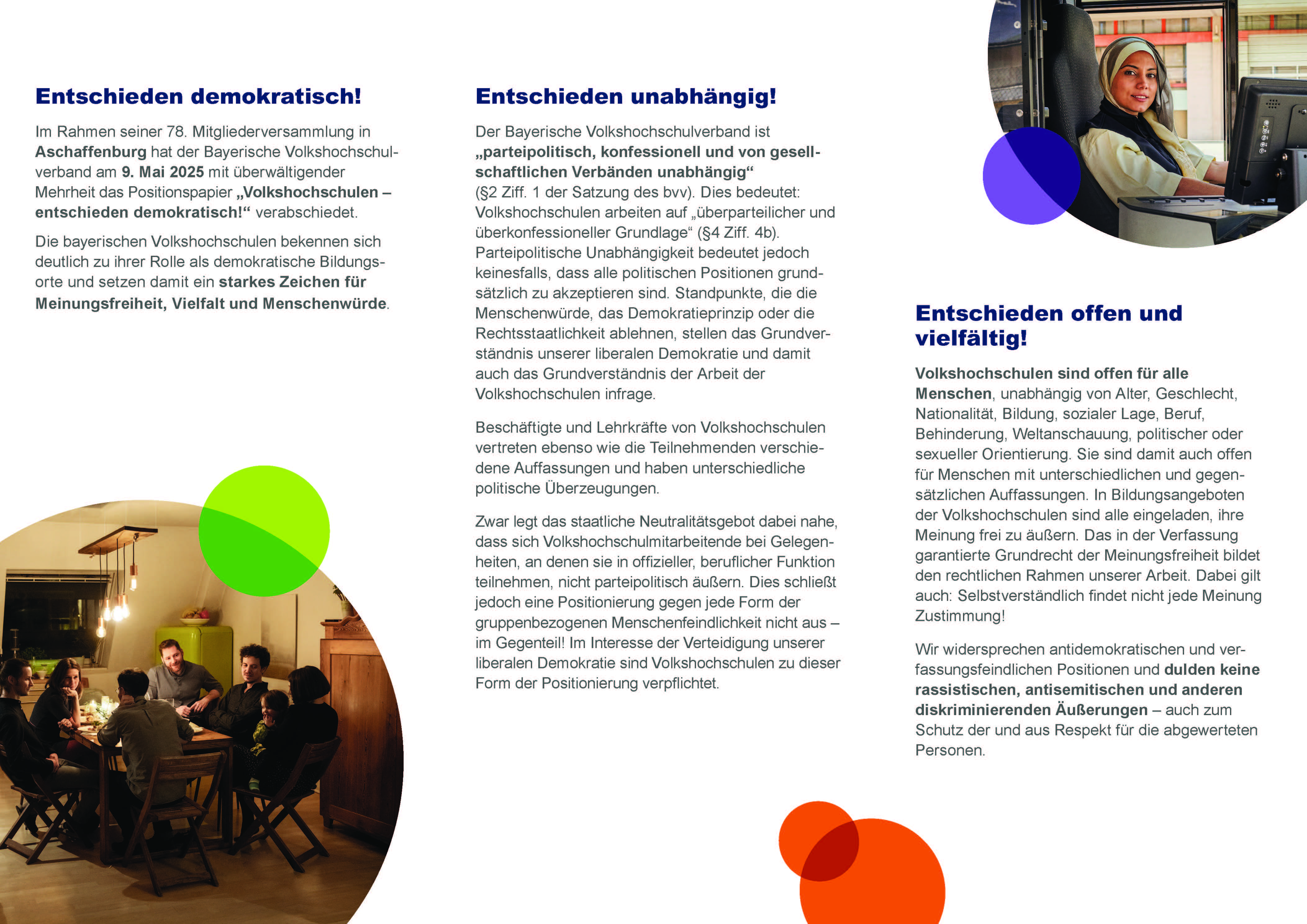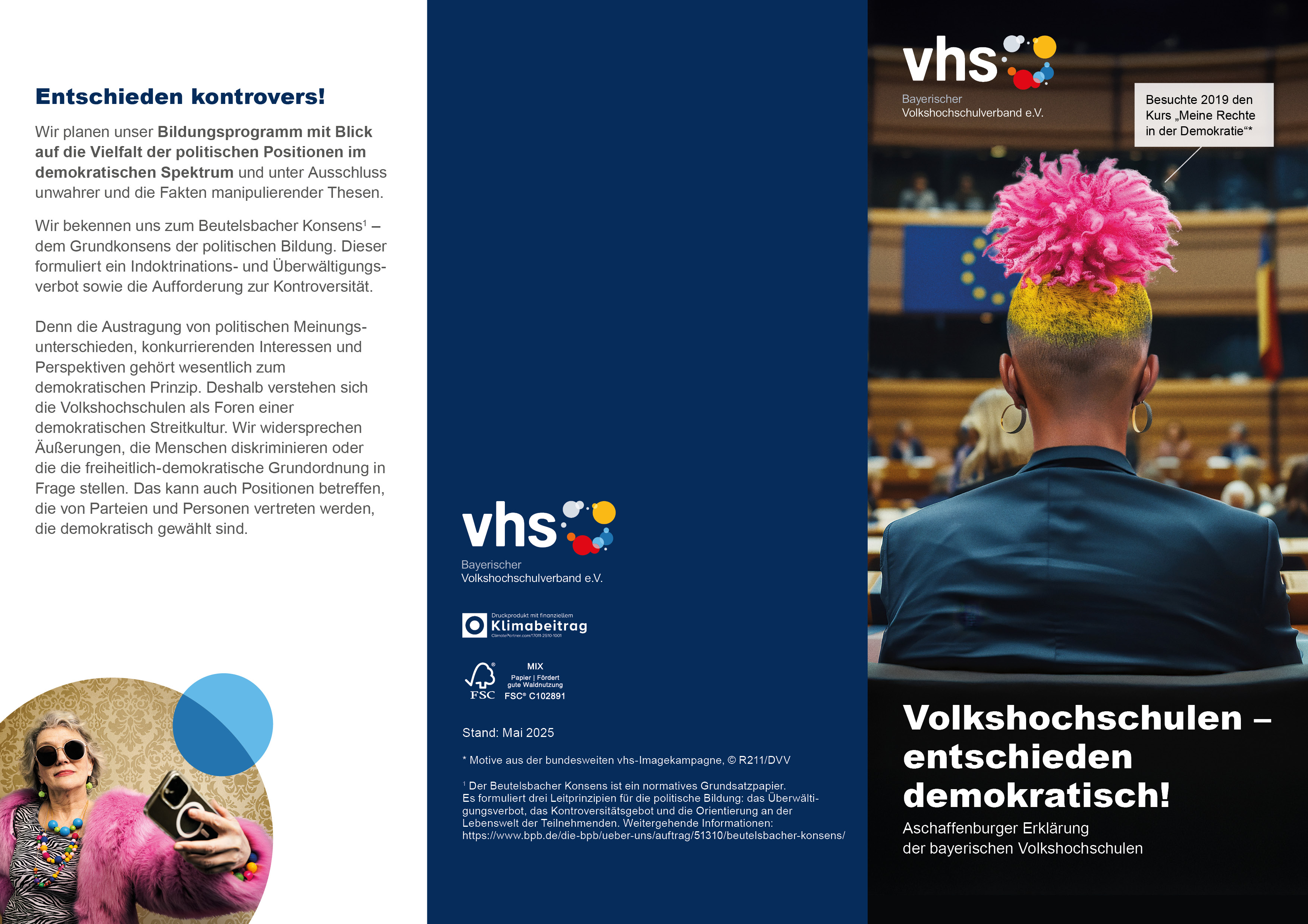 Die Aschaffenburger Erklärung wurde durch die 78. Mitgliederversammlung des Bayerischen Volkshochschulverbands am 9. Mai 2025 verabschiedet. FSC-zertifiziert und klimaneutral gedruckt. Verpackungseinheit 10 Stück. Der bvv stellt die Broschüre kostenfrei zur Verfügung. Kosten fallen für Verpackung, Versand und Handling i.H.v. 8,50 €/ VE an.