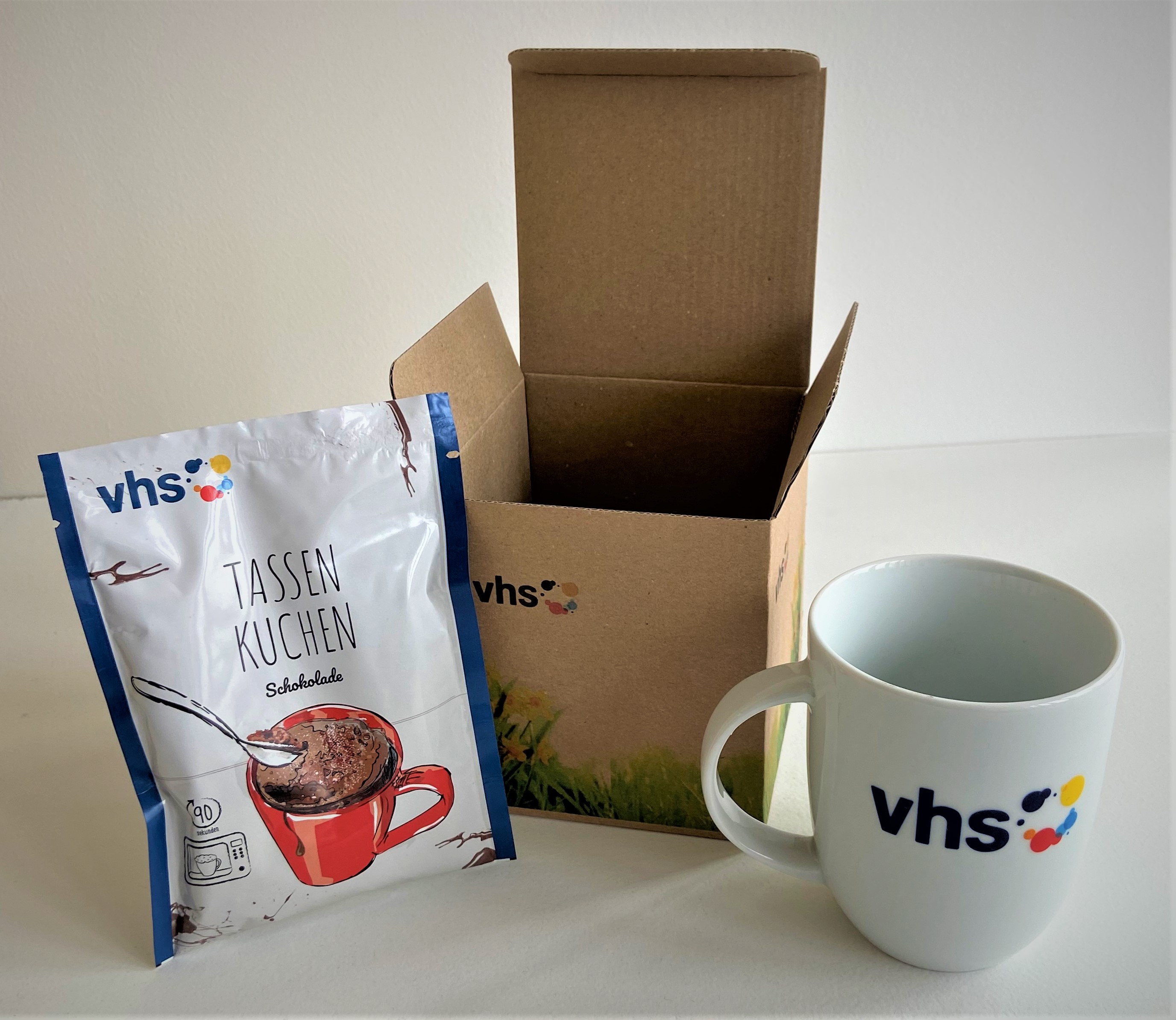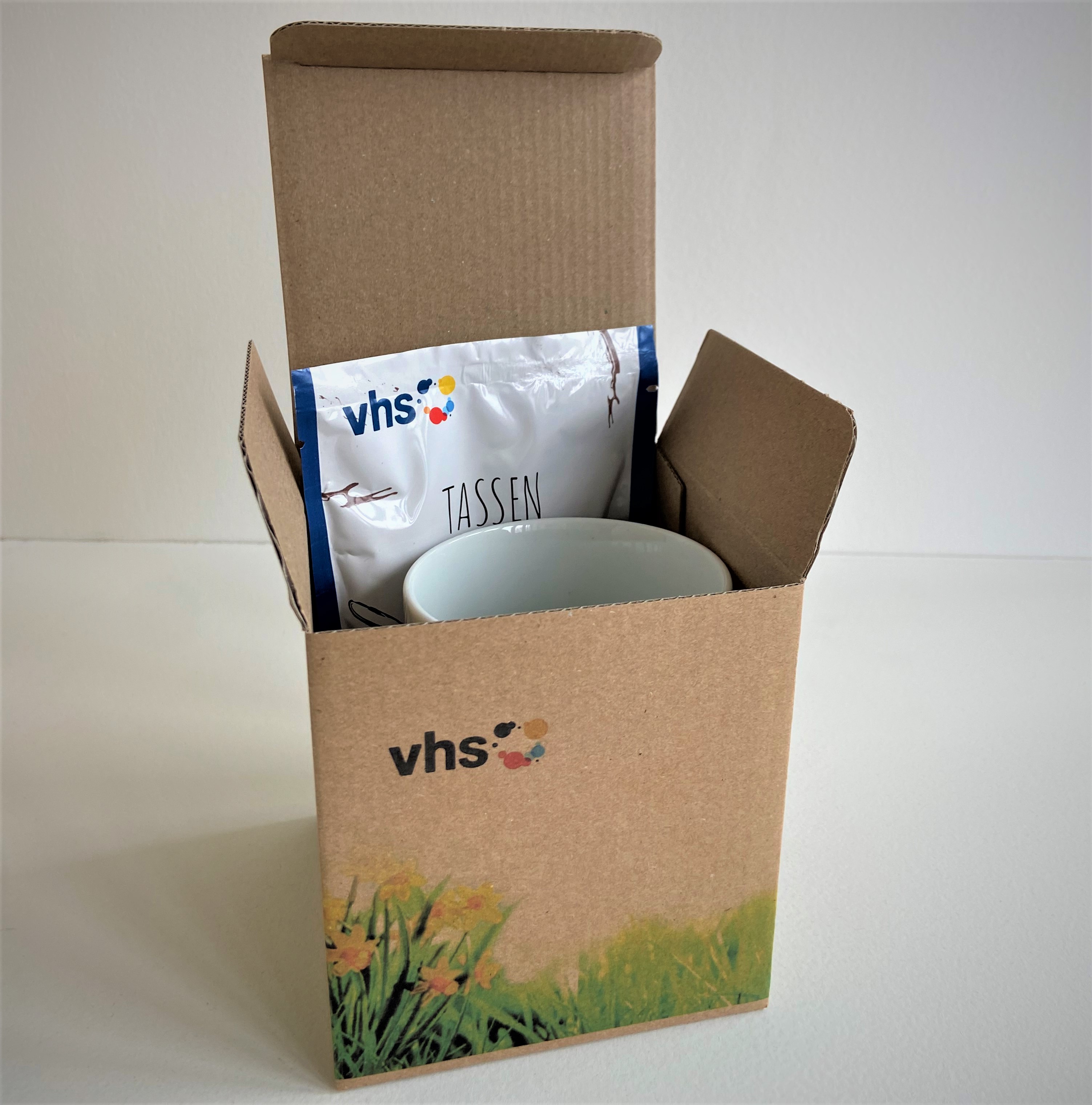 Geschenkbox aus Karton mit Eco-Aufdruck, die Tinte ist auf Wasserbasis. Hergestellt in Europa und FSC-zertifiziert. Inhalt: Tasse Darja aus weißem Porzellan mit vhs Logo rechts und links vom Henkel sowie Tassenkuchen. Maße Geschenkbox: 10,2 x 10,2 x 11,2 cm.