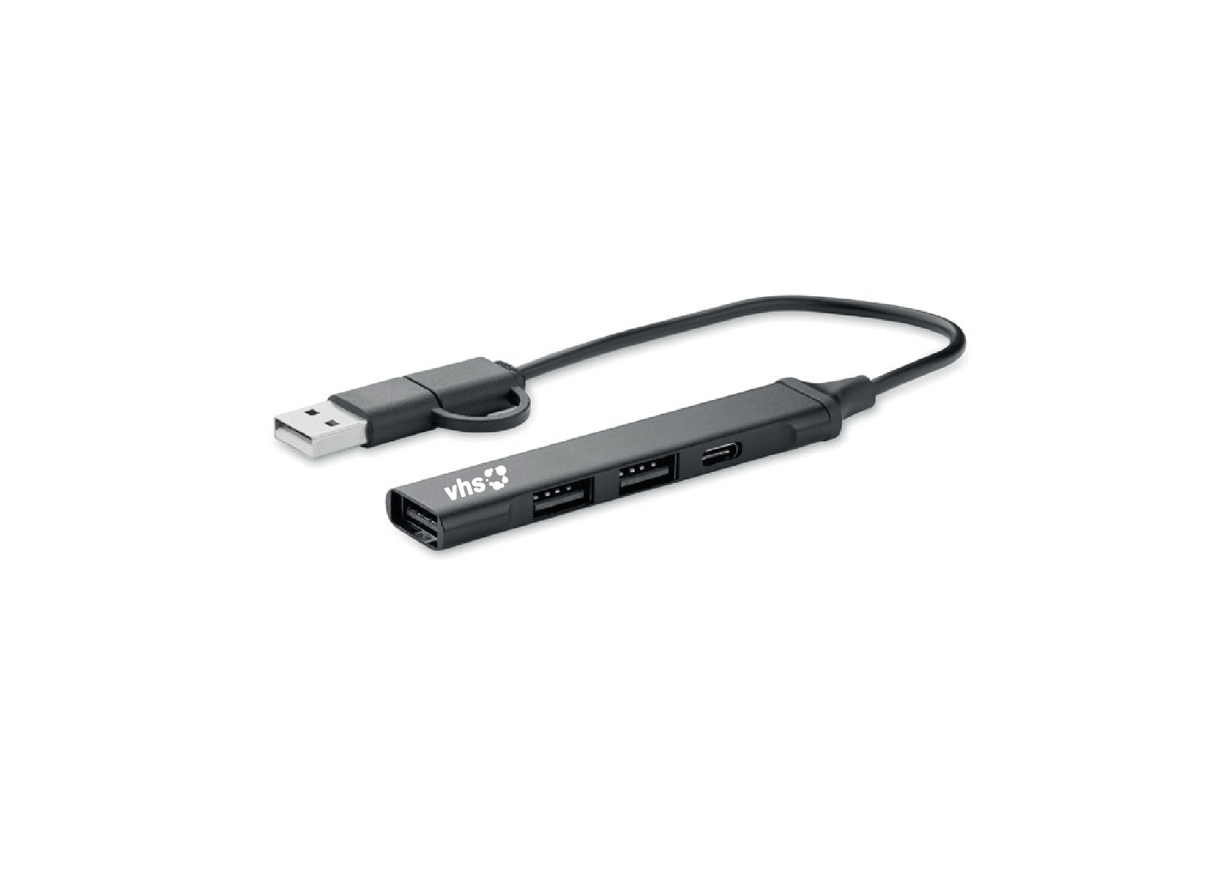 4 Port USB-Hub aus recyceltem Aluminium. 3 USB-A + 1 Typ-C. Eingang: 2-in-1 Typ-C & Typ-A. Kabellänge: 19 cm. Inkl. vhs Logodruck.